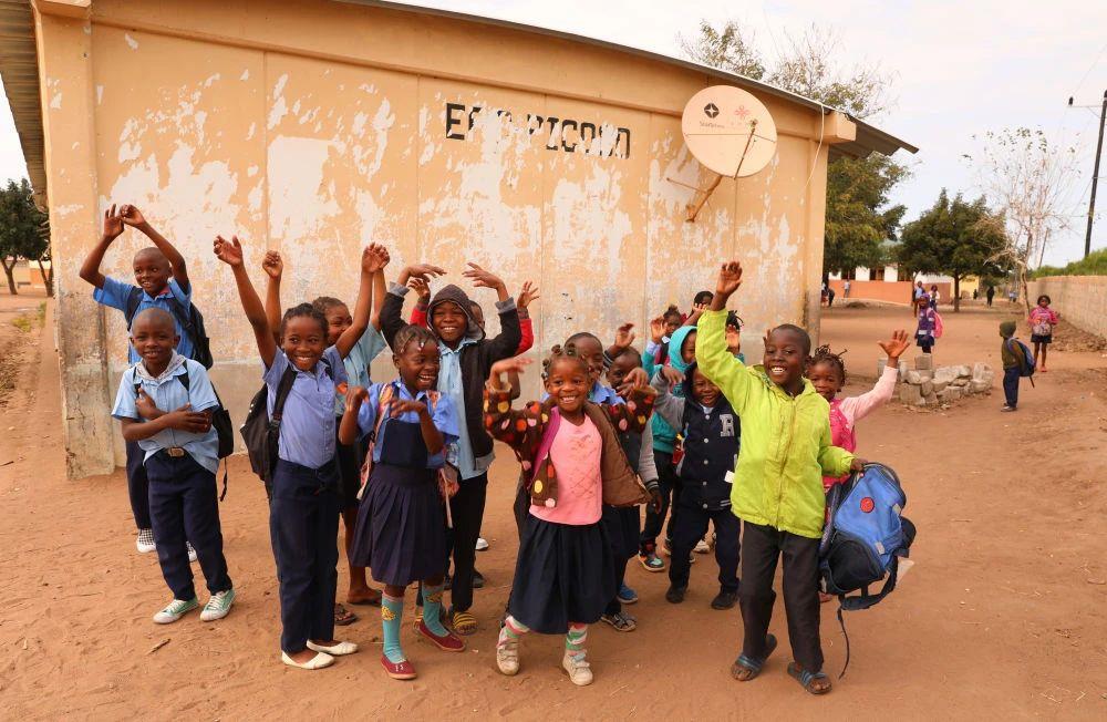 △2023年7月,莫桑比克马普托省皮科科村学校的孩子们站在装有中国援助的卫星电视接收天线的房屋前。