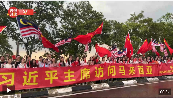 习近平乘车从机场赴下榻饭店途中,当地华侨华人在道路两旁挥舞中马两国国旗,高举“热烈欢迎习近平主席访问马来西亚”、“中马友谊万岁”的红色横幅,以喜庆热烈的舞狮表演欢迎习近平主席到访。