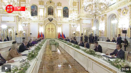 当地时间5月8日上午,俄罗斯总统普京同中国国家主席习近平在莫斯科克里姆林宫举行会谈。