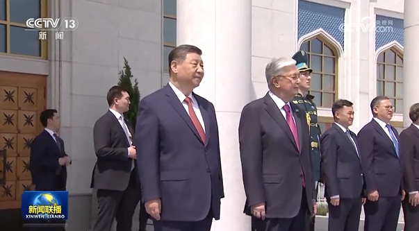 习近平抵达阿斯塔纳纳扎尔巴耶夫国际机场时,托卡耶夫总统率总统办公厅主任达杰拜、副总理兼外长努尔特列乌、总统外事顾问卡济汉、阿斯塔纳市长卡瑟姆别克等高级官员热情迎接。身着盛装的哈萨克斯坦女青年向习近平献花。礼兵分列蓝地毯两侧致敬,哈萨克斯坦少年儿童手持中哈两国国旗热烈欢迎习近平到访。习近平在托卡耶夫陪同下观看仪仗队分列式,直升机悬挂中哈国旗从机场上空飞过。在机场贵宾楼内,两国元首还共同欣赏哈萨克斯坦少年儿童的文艺表演。