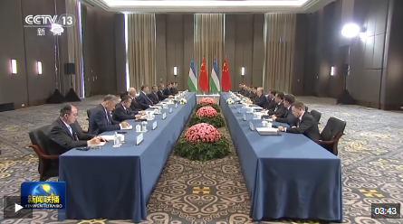当地时间6月17日上午,国家主席习近平在阿斯塔纳出席第二届中国-中亚峰会期间会见乌兹别克斯坦总统米尔济约耶夫。