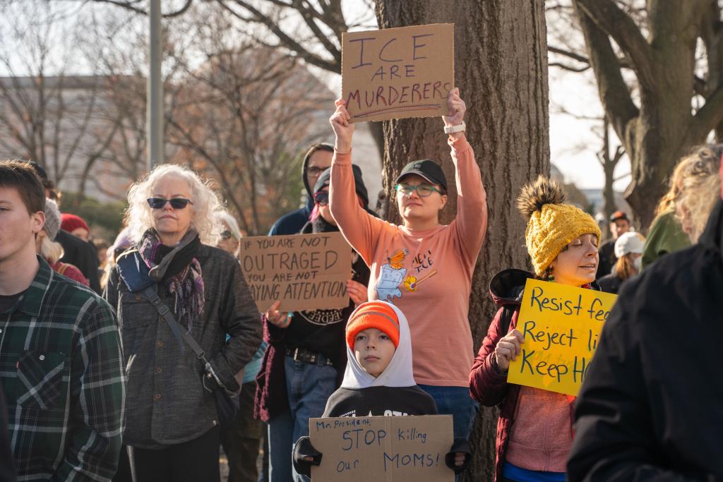 1月11日,在美国首都华盛顿,民众抗议移民与海关执法局暴力执法。近日,美国多地民众举行游行示威,抗议移民与海关执法局(ICE)执法人员在明尼苏达州明尼阿波利斯市开枪打死一名美国籍女子。新华社发(李源清摄)