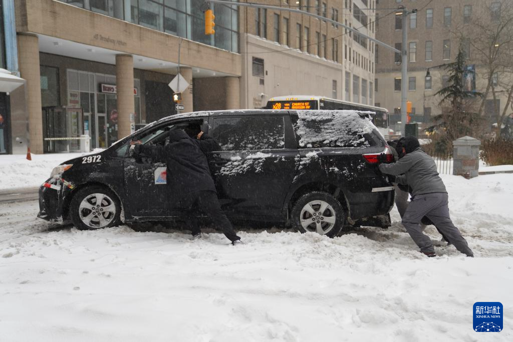 1月25日,在美国纽约,人们推动陷在雪中的汽车。新华社记者 张凤国 摄