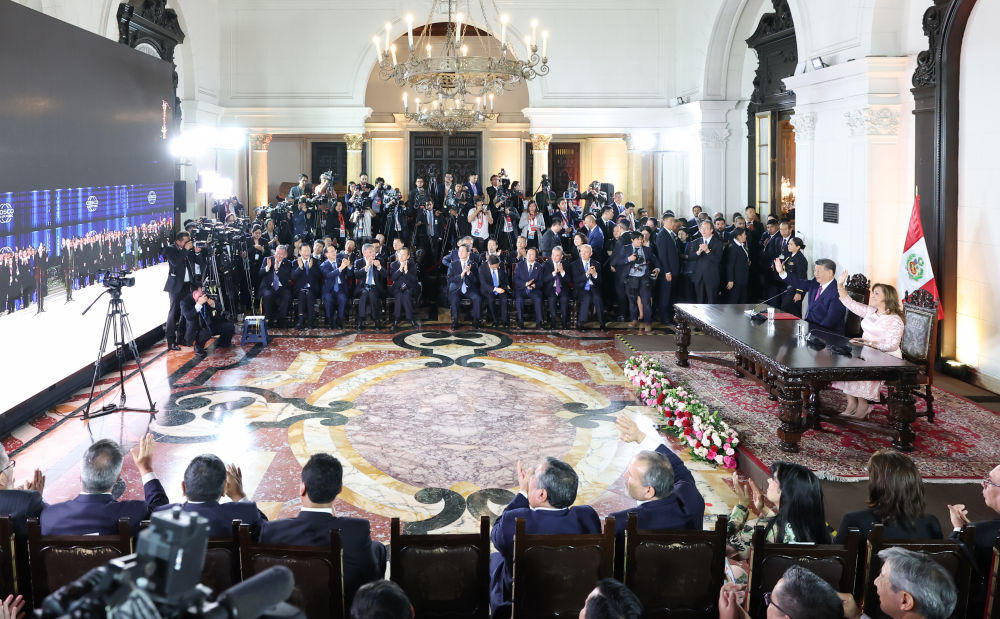 当地时间11月14日晚,习近平主席同博鲁阿尔特总统在利马总统府以视频方式共同出席钱凯港开港仪式。
