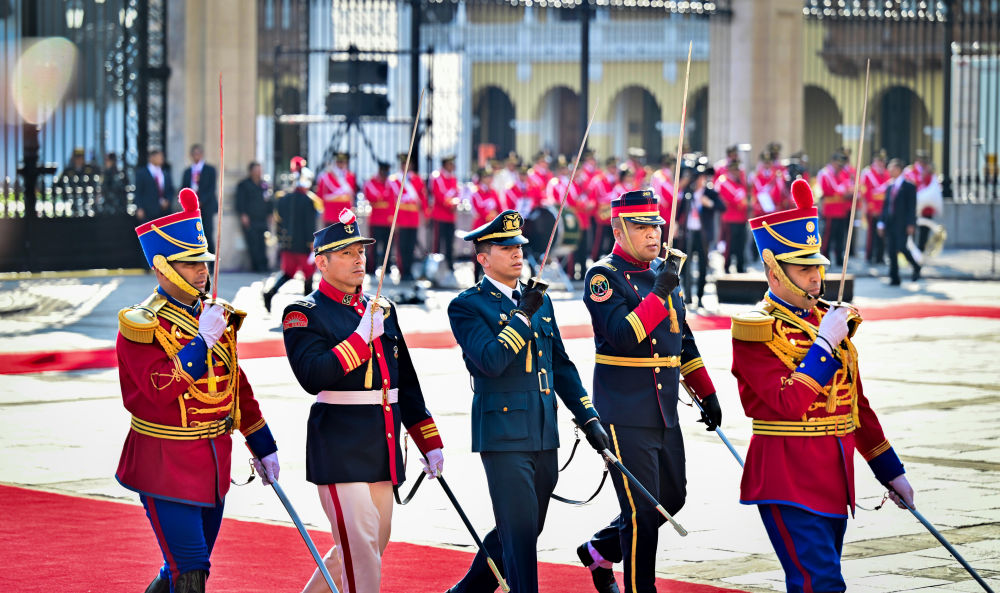 当地时间11月14日下午,国家主席习近平同秘鲁总统博鲁阿尔特举行会谈。在秘鲁礼宾马队护卫下,习近平乘车抵达总统府,受到博鲁阿尔特总统热情迎接。博鲁阿尔特在总统府前广场为习近平举行隆重盛大欢迎仪式。