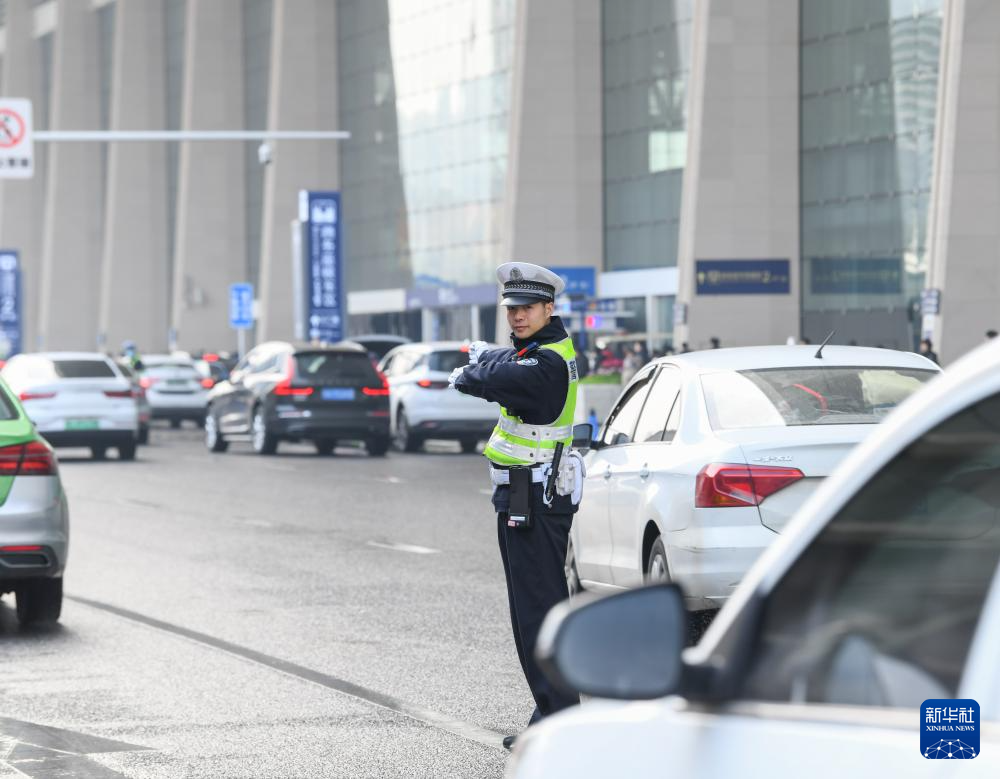 1月14日,在成都东站北落客平台,成都铁路公安处交通警察支队民警熊杰在指挥交通。