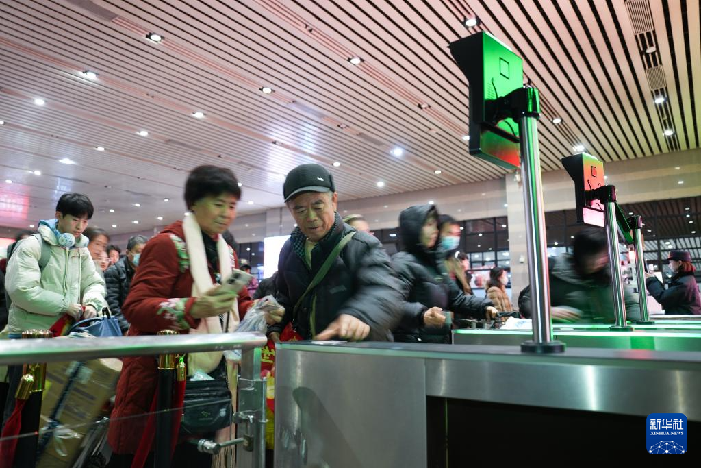 在北京西站,乘坐北京西至合肥的K4159次列车的旅客在检票进站(1月13日摄)。这趟列车于1月14日0时02分发车,是北京地区开出的2025年春运首趟旅客列车。