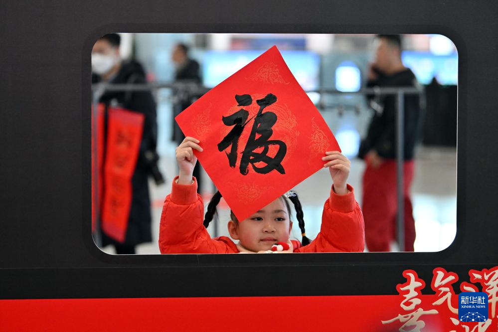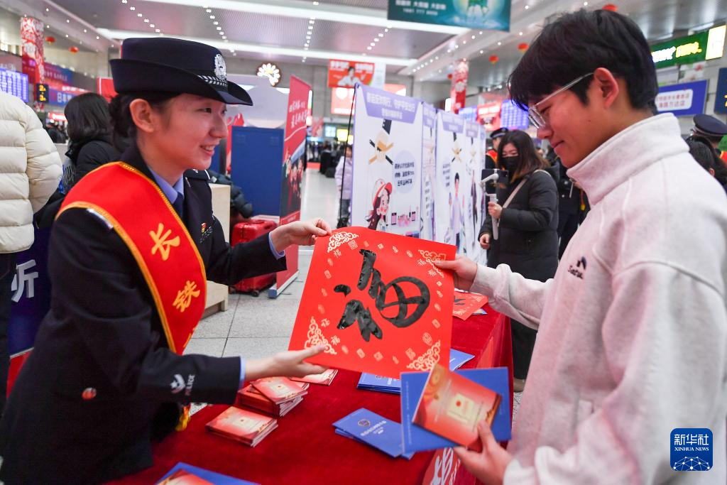 1月14日,在长春站候车大厅,长春铁路公安处民警为旅客送福字。