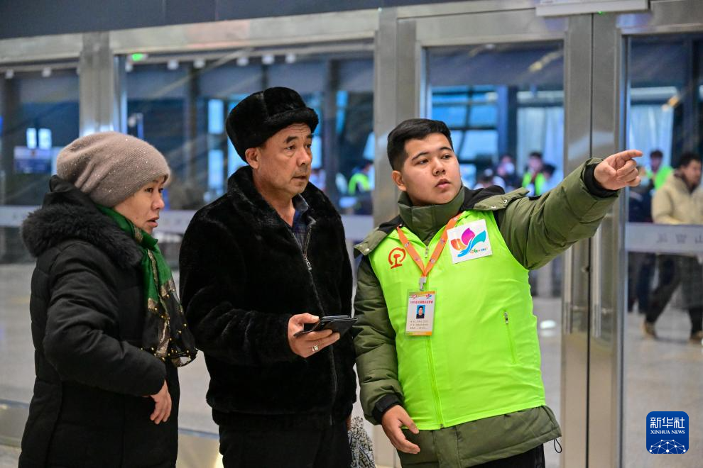 1月14日,在新疆乌鲁木齐站候车大厅,志愿者为乘客指路。