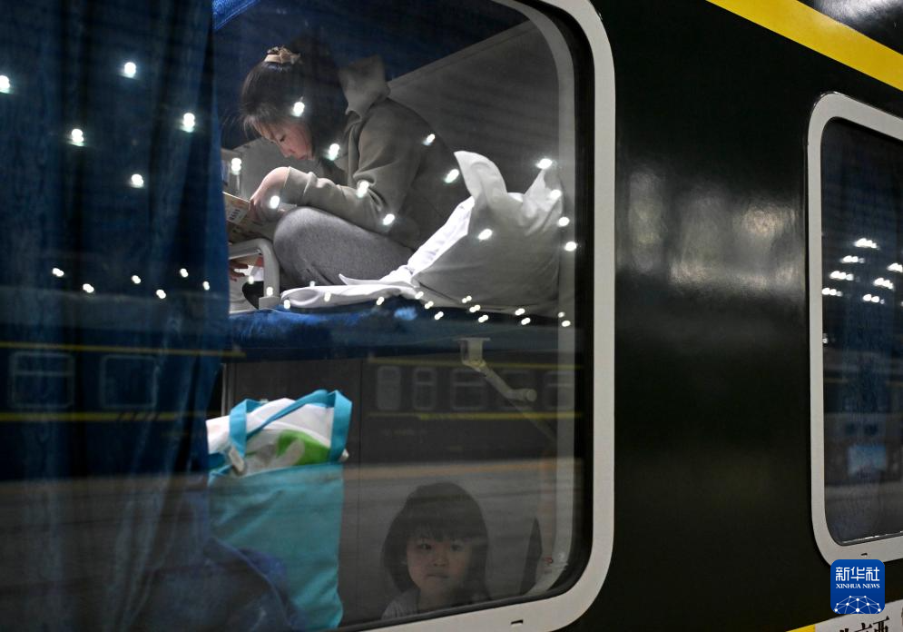在1月14日0时02分发车的北京地区春运首趟旅客列车K4159次的车厢中,一位小乘客在阅读(1月13日摄)。