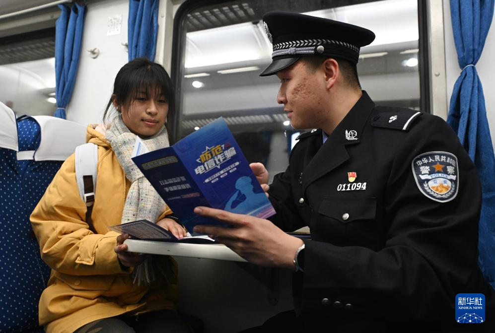 北京铁路公安处乘警支队宣传小队的警官王海洋在北京西至合肥的K4159次列车上为乘客讲解如何防范电信诈骗(1月13日摄)。这趟列车于1月14日0时02分发车,是北京地区开出的2025年春运首趟旅客列车。