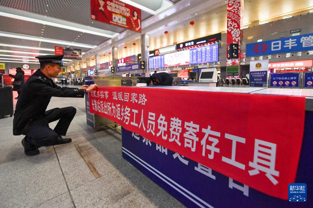 1月14日,在长春站候车大厅,长春铁路公安处民警设置服务台,为旅客寄存无法带走的工具。