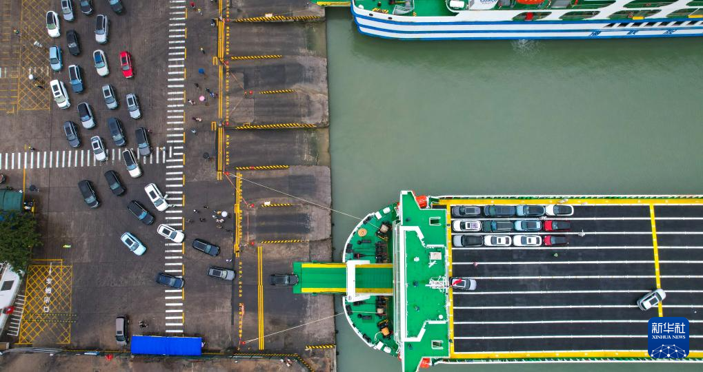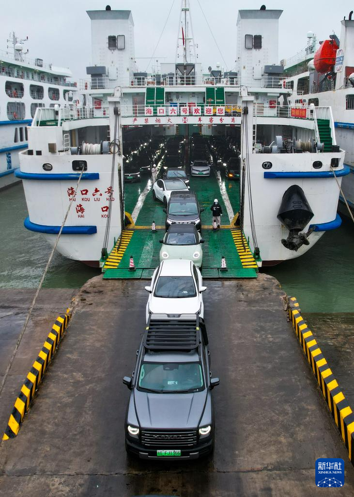 1月14日,在海南省海口市秀英港,车辆有序驶离客滚船(无人机照片)。