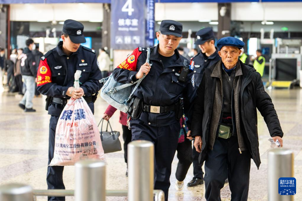 1月14日,在长沙火车站,铁路民警帮助旅客搬运行李。