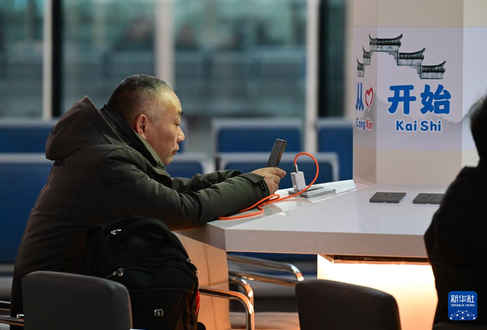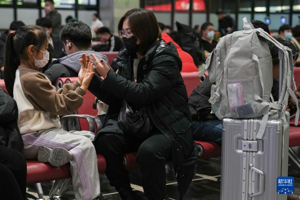 在北京西站,9岁的小果(左一)在候车室内与妈妈玩游戏,等候乘坐K4159次列车返回安徽阜阳老家过年(1月13日摄)。这趟列车于1月14日0时02分发车,是北京地区开出的2025年春运首趟旅客列车。