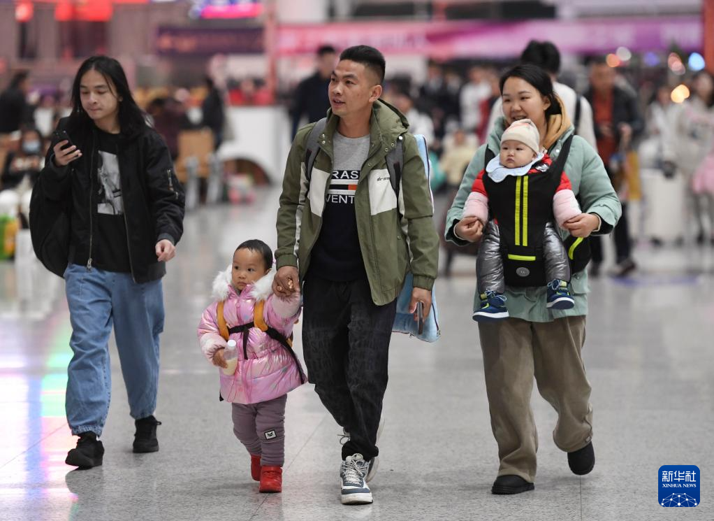 1月14日,在西安站候车大厅,小朋友和家人准备进站乘车。