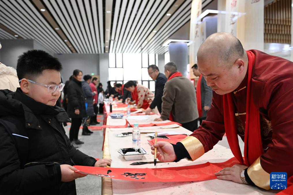 1月14日,在西安站春运送福活动上,书法家为旅客免费书写春联。