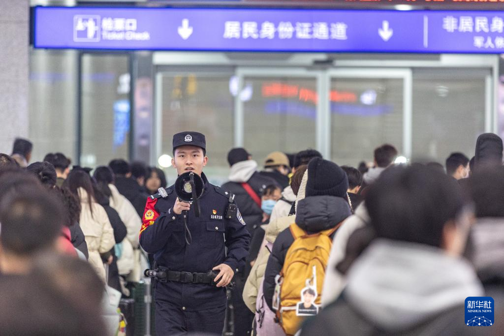 1月14日,在重庆北站候车大厅,重庆铁路公安处民警在疏导人流。