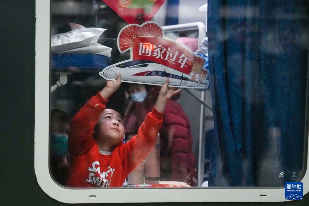 在北京地区春运首趟旅客列车K4159次发车前,一位小乘客拿着“回家过年”的标牌在车厢内玩耍(1月13日摄)。这趟北京西至合肥列车于1月14日0时02分发车。