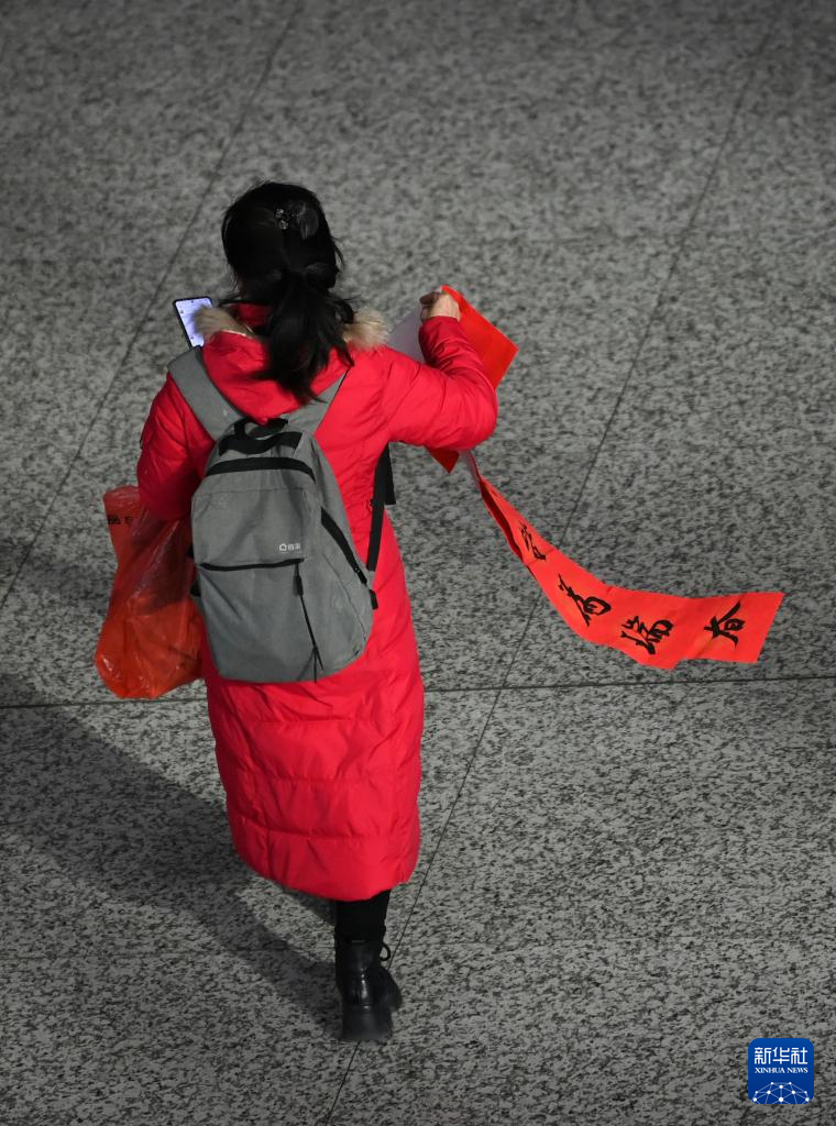 1月14日,在西安站候车大厅,一名旅客手持春联进站候车。