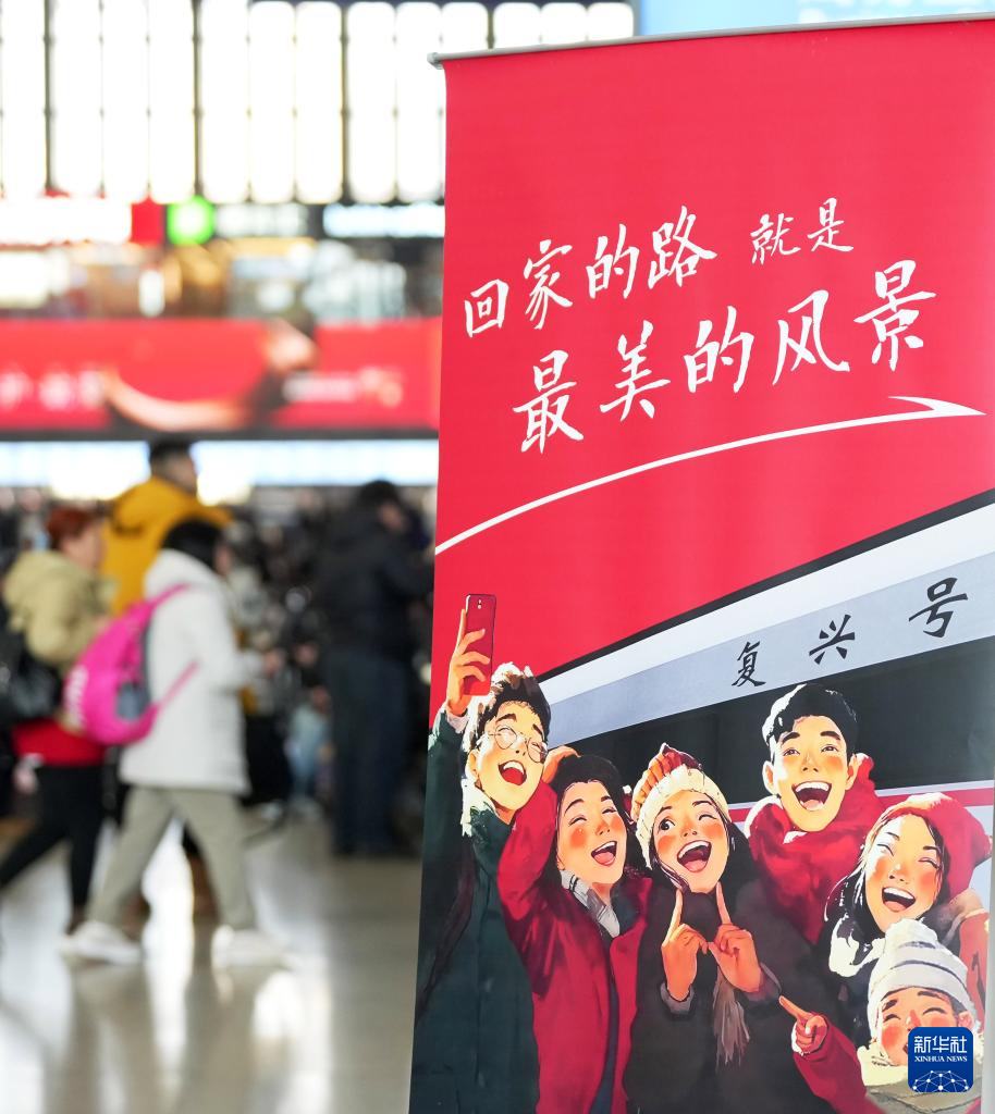 1月14日,乘客从沈阳火车站候车大厅的宣传海报旁走过。