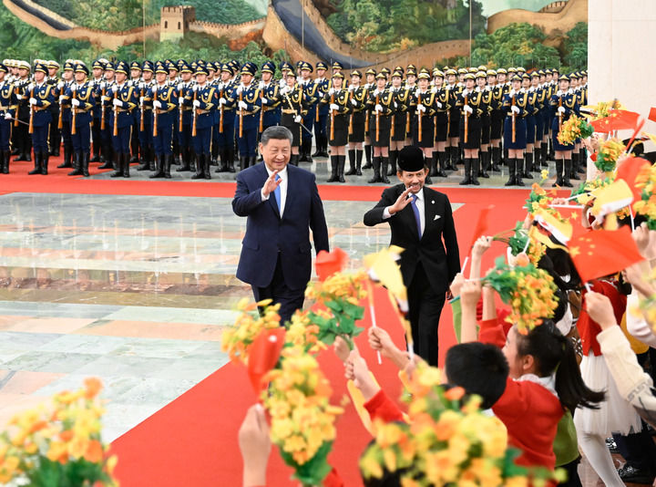 2月6日上午,国家主席习近平在北京人民大会堂同来华进行国事访问的文莱苏丹哈桑纳尔举行会谈。这是会谈前,习近平在人民大会堂北大厅为哈桑纳尔举行欢迎仪式。新华社记者 高洁 摄