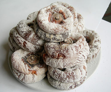 曹州耿饼 菏泽古称曹州,以菏泽市东郊耿庄一带镜面柿为原料做成的柿饼风味最好,镜面柿、旋去皮、日晒、捏制而成的柿饼叫耿饼。耿饼肉质细韧,色泽橙黄透明,霜厚无核,入口无核、入口成浆,味醇凉甜,营养丰富,且耐存放,久不变质,历来被人们誉为柿饼中的上品。早在明朝永乐年间曾做为贡品进献朝廷,因而驰名全国,被称为曹州耿饼,曹州耿饼是菏泽传统的名特产。耿饼还有较高的药用价值,有清热、润肺、化痰、健脾、涩肠、治痢、止血、降血压等功能。柿霜可治疗口疮、喉疼、润肺化痰、止痢等功效。