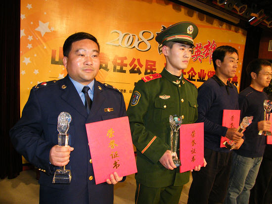 1月10日,作为2008山东“十大优秀责任公民”之一,市工商局牡丹分局吕陵工商所副所长侯玉林(左一)在山东新闻大厦新闻大会堂接受颁奖。几年来,侯玉林一直投身于救助贫困生事业,兼任牡丹区慈善总会红盾分会会长、牡丹区关工委“红盾情”委员会主任等职。
