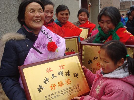 “奶奶,您的奖牌真好看!”近日,单县朱集镇门庙村7岁的许诺要抱抱奶奶王玉兰的刚获得的红花“好婆婆”奖牌。当日,在由环亚家电有限公司冠名支持的门庙村精神文明建设2008年度人物评选表彰活动中,王玉兰、诸葛景霞等6名“好媳妇”、“好婆婆”受到褒奖。据了解,这样的评选表彰活动该村已举办了6届,奖励“好媳妇”、“好婆婆”50多人次。目前,单县正在开展“巾帼牵手、共建和谐”活动,环亚家电有限公司、教育局等22个企事业单位妇委会(女工委)与门庙村、尤庄村等22个新农村结对子,帮助提高农村妇女精神文明素质和增收致富能力。