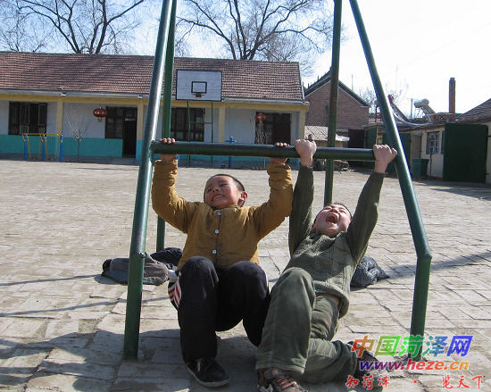 3月10日,在定陶县留守小学院内,两个小学生在简单的健身器材上翻跟头,玩得兴高采烈。 艾慧丽 摄