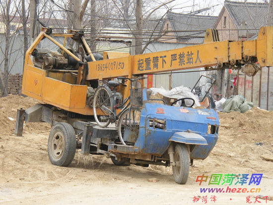 一辆机动三轮车经过简单改造,变身“吊车”。如此装备,让人担心。3月10日,记者刘锦摄于市长江路。
