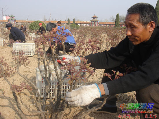 昨日,记者在曹州百花园看到,六十余亩牡丹枝繁叶盛,花骨朵已悄悄探出了头。园内一角,十几位花农正忙着修剪牡丹枝条和牡丹花芽(如图)。据介绍,我市牡丹目前正处于生长过程中的一个关键时期——小风铃期,如遇摄氏零下三四度的寒冷空气,花骨朵和茎很容易冻坏,影响开花。