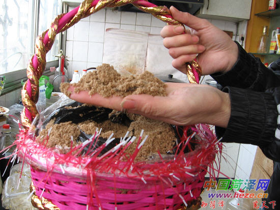 中国菏泽网1600000热线消息 昨日,市民吕女士向本报反映,一亲戚给她送来一篮鸡蛋,但打开包装一看,篮子里只有一层鸡蛋,下边全是用黑色塑料袋装的锯末。