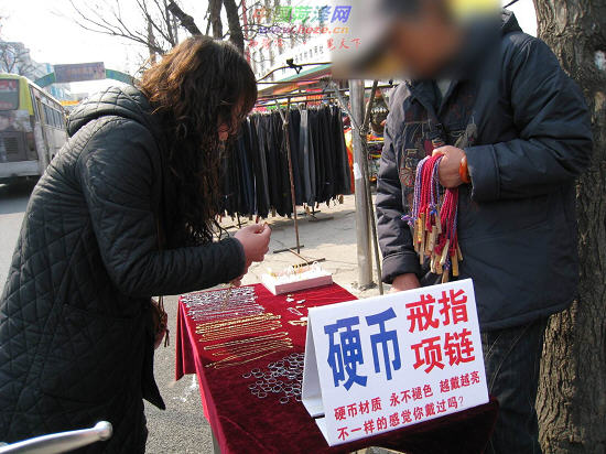 4月3日下午,记者在市东方红大街新世纪广场附近看到好几个小摊上都摆着“硬币戒指,永不褪色”之类的牌子,并有不少市民问价、购买。在一摊位前,记者看到摊主面前的桌子上摆着戒指、项链、手镯等首饰,旁边还放着一些1元、5角的硬币。摊主向记者介绍:“这些首饰全都是用硬币做成的,而且都经过抛光打磨,绝对不会褪色,你放心买就是了。”“戴上不褪色,而且价格便宜。戴久了,如果不喜欢了扔掉也不觉着可惜。”一购买了一条项链的年轻姑娘对记者说。