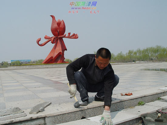 日前,在曹州牡丹园里,工人师傅正在维修中心广场破损的瓷砖。为迎接国际牡丹花会到来,曹州牡丹园工作人员提前着手,对园区进行清扫、整理、修缮,并补植大量花卉、树木,以崭新的面貌喜迎四海宾客。