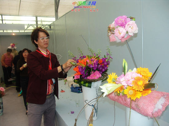 中国菏泽网消息 4月15日上午,在曹州牡丹园举行的第七届中国牡丹插花艺术展暨第二届国际牡丹插花艺术展上,来自马来西亚的花艺师陈勇良现场制作的插花引来了众多游客观赏。“我三天前就来到菏泽,专门为这次插花展制作了‘月上柳梢头’、‘人约黄昏后’等作品。”陈勇良对记者说。