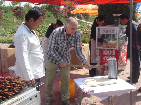 4月17日,一名外籍游客在曹州牡丹园内挥槌制作朝鲜打糕。这位名叫Franction的游客出生于捷克,拥有德国国籍,现居意大利。当日,他在曹州牡丹园观花时对朝鲜打糕产生浓厚兴趣,便在一位师傅指点下挥槌制作起来。
