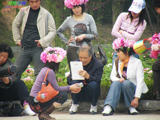 游玩间隙,一名画师在给一群年轻人讲授牡丹画法。4月22日,记者刘锦摄于曹州牡丹园。
