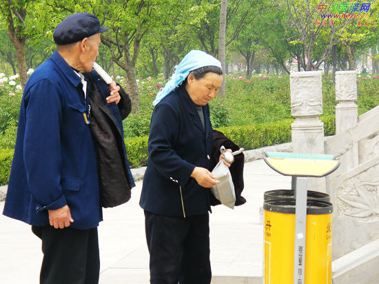 两位从农村来观赏牡丹花的老年游客,将垃圾扔进垃圾桶。4月22日,记者刘锦摄于曹州牡丹园。