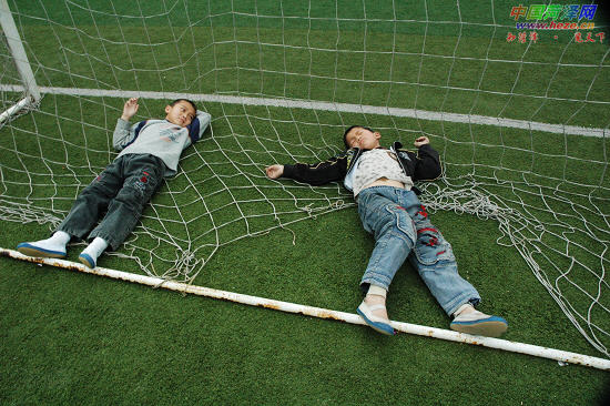 4月22日下午,在菏泽市实验小学南校区,两名学生上完体育课上累了,悠闲地躺在球门边休息。