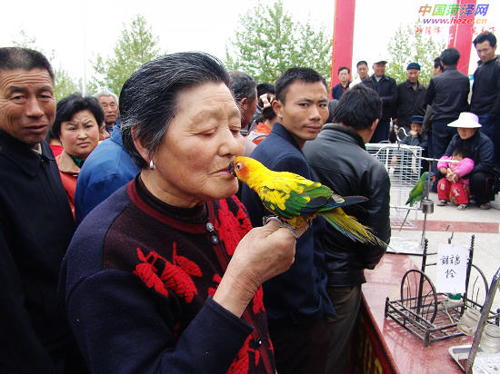 一位老太太和爱鸟“金太阳”接吻,让众人感受到“人鸟和谐”。4月22日,记者张洪梅摄于菏泽牡丹体育广场