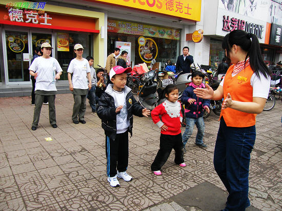 几个小朋友跟着老师学跳舞,大家一起把身健。4月19日,记者刘锦摄于市东方红大街