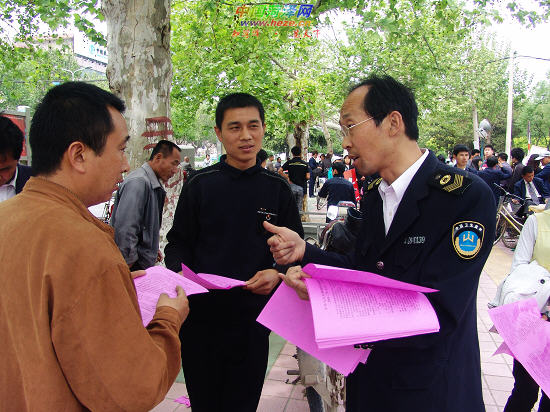 4月28日上午,牡丹区卫监执法人员在市区街头宣传《职业病防治法》。本周是我国第七个《职业病防治法》宣传周,今年宣传周的主题是“保护农民工健康是全社会的共同责任”。