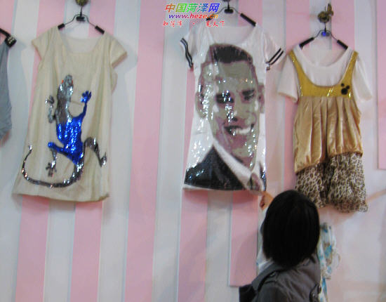在菏泽古邑商城一服装店内,挂有一款印有美国总统奥巴马笑脸的女士T-恤,这位美国偶像总统还挺受菏泽女性的欢迎。据服装店老板介绍,来他店中的不少顾客都购买了这款体恤。