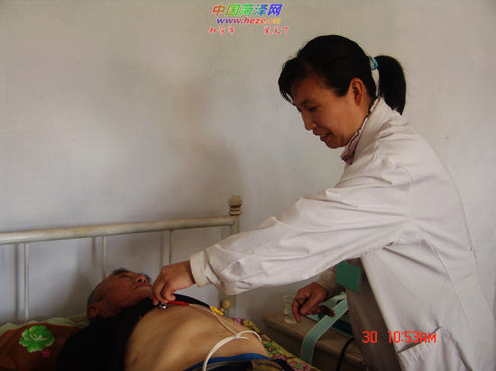 从5月8日开始,东明县第二人民医院将历时一个月对东明集镇30个行政村,50岁以上老人进行免费查体。他们针对老年常发病,为老年人进行心、脑电图、B超及血压检查,做到早发现、早预防、早治疗。图为医务人员正在该镇刘庄行政村村民查体。