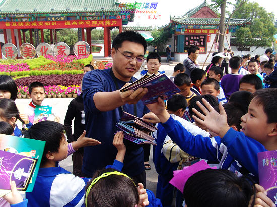 5月12日,在菏泽天香公园门前,市气象局工作人员向市实验小学的学生发放减灾宣传画册。今年5月12日是我市首个“防灾减灾日”,市减灾委员会和市气象、科技、国土、水利、地震、人防等部门在全市开展多项活动,把防灾减灾知识送进社区、学校、单位、家庭,以增强全社会的灾害风险防范意识。