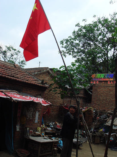 5月16日,当记者走进巨野县龙堌镇北村蔡高士老人家的院子时,首先映入记者眼帘的是一面迎风招展的红旗,而在屋门上有这样一幅对联:“破烂王简朴度日,援灾区美名传扬”