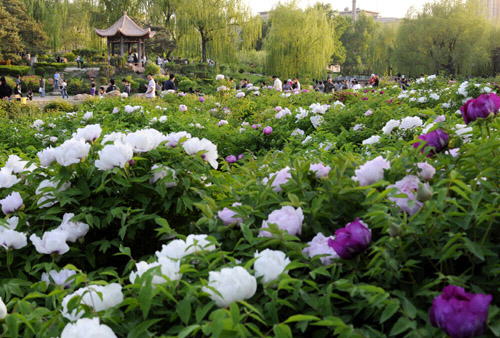 长春市牡丹园内,盛开的牡丹花吸引众多市民前往观赏。 邵守志 摄