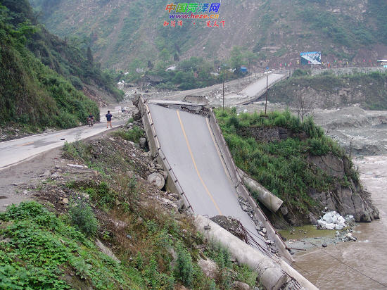 在友谊隧道里看到那块写着“汶川界”的路牌,我们知道已经到了映秀的地界,山路也变得更加崎岖。转过一个弯道,横跨在路旁的“5·12汶川特大地震震源点、百花大桥遗迹