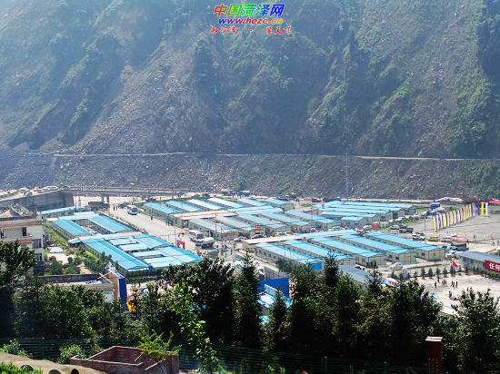 进入映秀,路旁一片蓝顶白墙的板房吸引了我们。这里就是岷江岸边曾经秀美的小镇吗?它也完全不是去年地震后的样子了,绝大部分的废墟已被推平,只有漩口中学几栋震裂的教学楼兀自矗立着。据了解,地震时映秀镇几乎全部被震成一片废墟,没有一间可以安全居住的房屋。全镇原有人口12000多人,地震后,只剩下不到4000人。与北川县城选择异地重建不同,震中映秀并未离开,并将在原址上恢复重建。因此,大多幸存的人们仍在这里坚守。